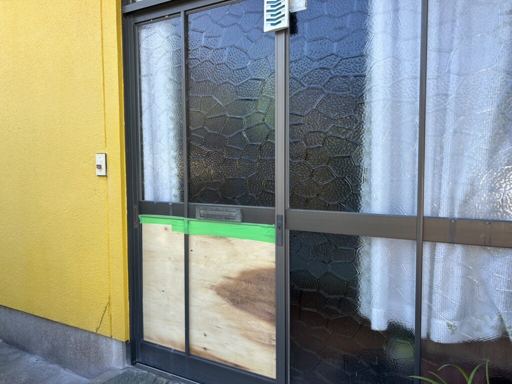 その日は日曜日で何も出来なかったので、防犯上の為合板だけ差し込んで応急処置。