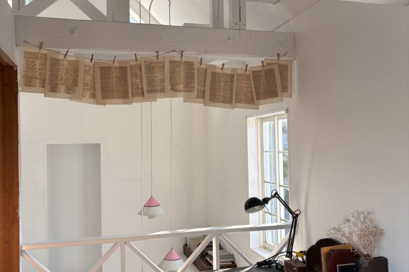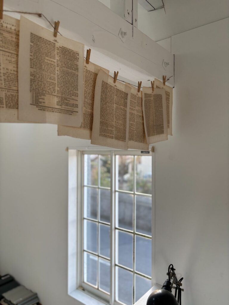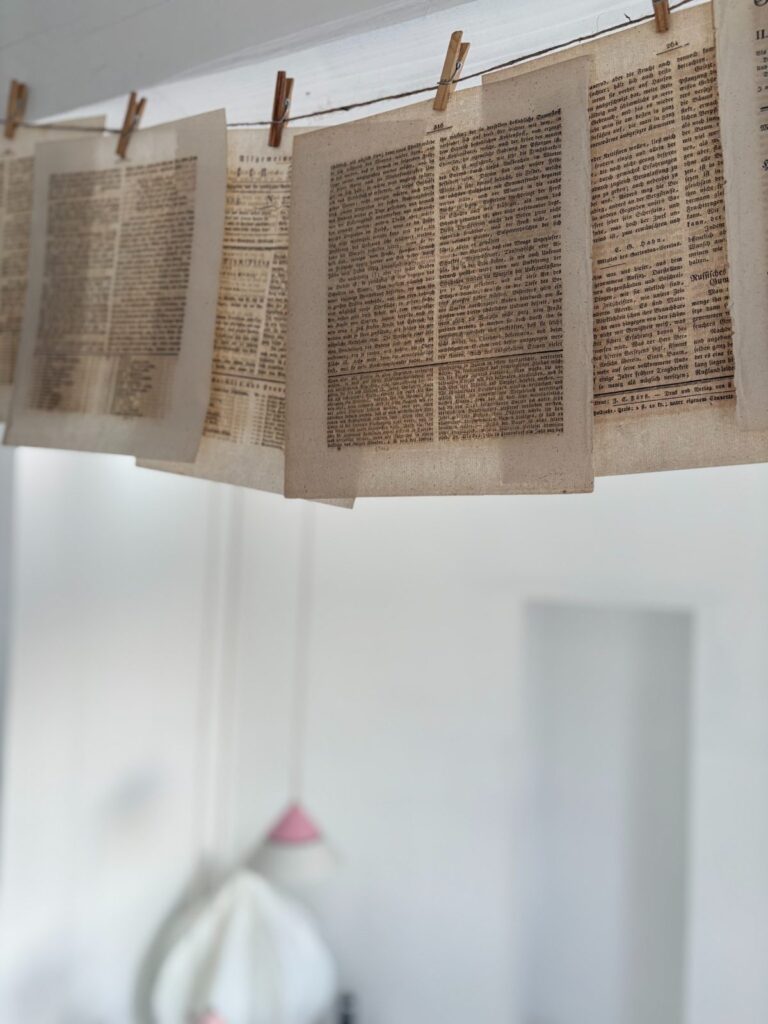 先日購入した、洋書と楽譜がバラバラになった物を、木製の洗濯ばさみで一枚ずつ。
