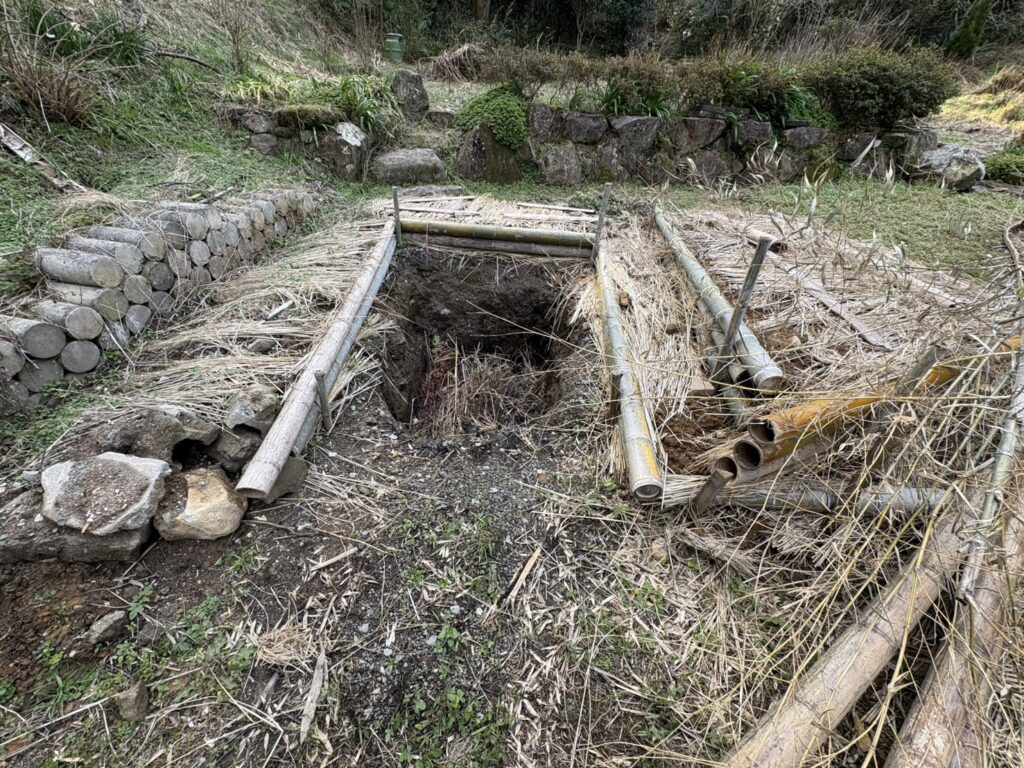 この穴は伐った竹を入れ、燃やして竹炭にするための穴です。